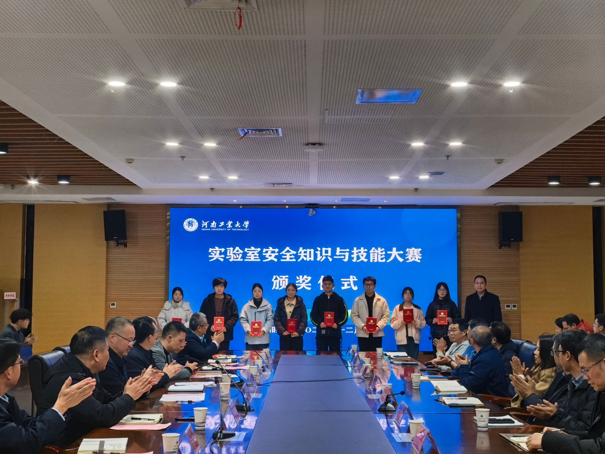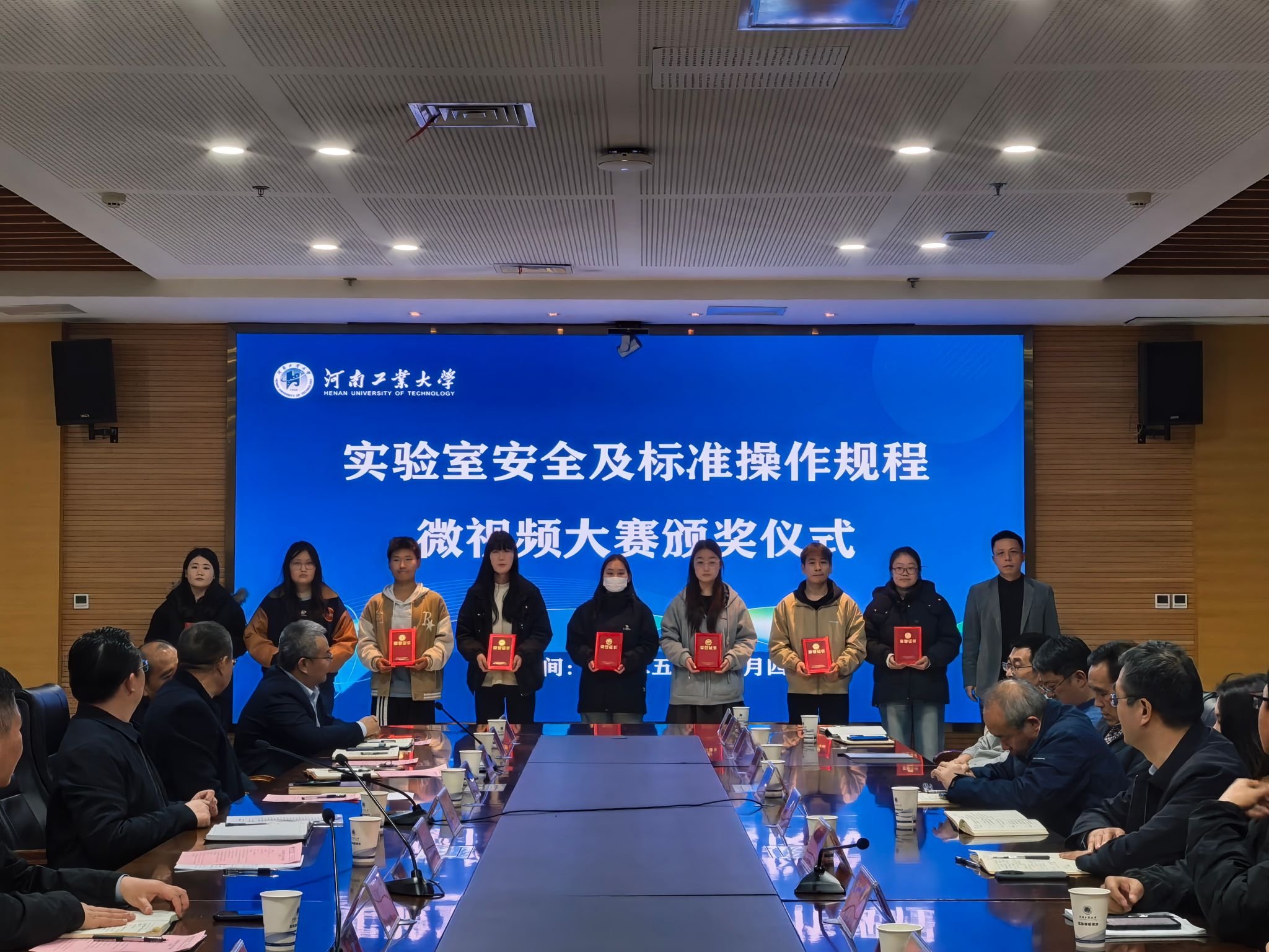 邓淼磊给获得“优秀组织奖”单位颁奖。校长办公室副主任、安全生产办公室副主任杨伟超和王磊分别给学校“第三届实验室安全及标准操作规程微视频大赛”和“2025年实验室安全知识与技能大赛”获奖学生代表颁奖。