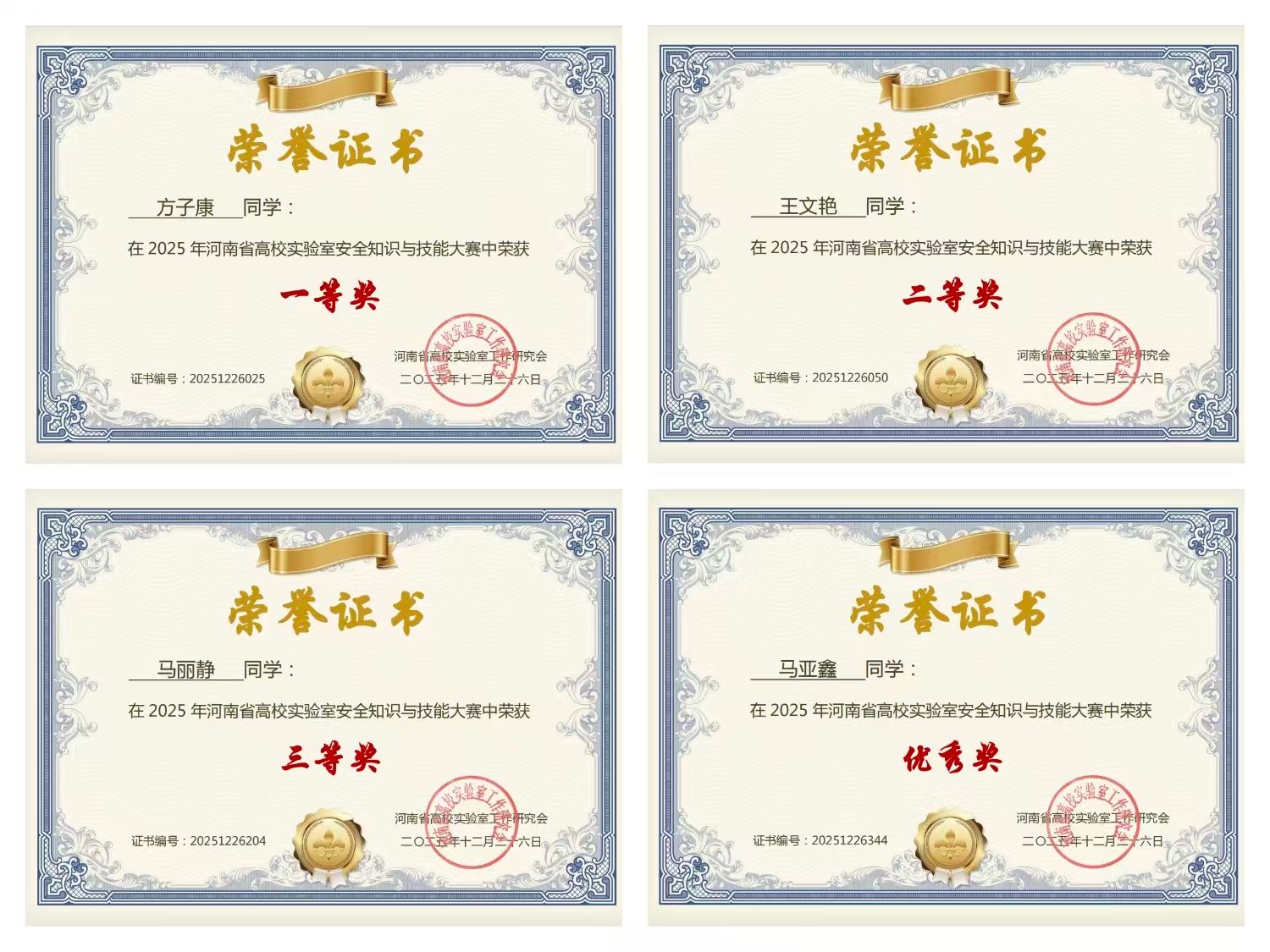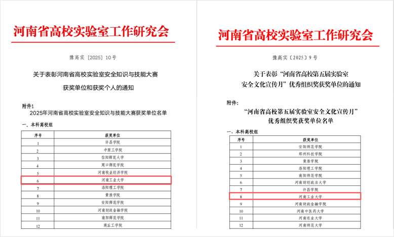 近日,河南省高校第五届实验室安全文化宣传月系列活动评选结果揭晓,学校凭借扎实有效的工作举措、丰富多元的活动形式,荣获“河南省高校第五届实验室安全文化宣传月优秀组织奖”“河南省高校实验室安全知识与技能大赛优秀组织奖”两项荣誉。同时,在省高校实验室安全知识大赛与技能大赛中,学校有19名同学获奖。其中机电工程学院方子康获一等奖,管理学院王文艳获二等奖,洪虹、白梅、马丽静等16名同学分别获三等奖和优秀奖。