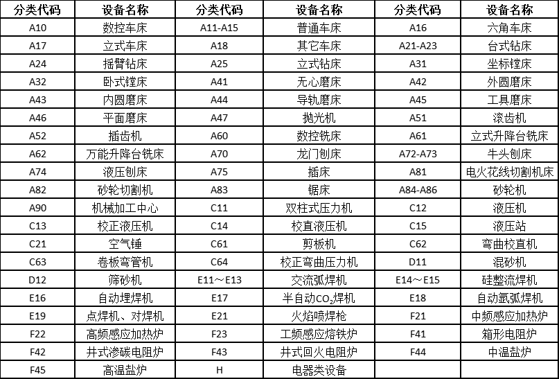 6.部门设备分类原则与方法:结合国家标准,将中心现有设备划分为金属切削机床(A、B类)、锻压设备(C类)、铸造设备(D类)、焊接设备(E类)、电炉(F类)、电器(H类)等六大类。详细分类及编号见附录4;另根据设备在教学、生产中的地位,及设备管理工作的需要,列出重点设备作为重点管理对象。重点设备的范畴为: