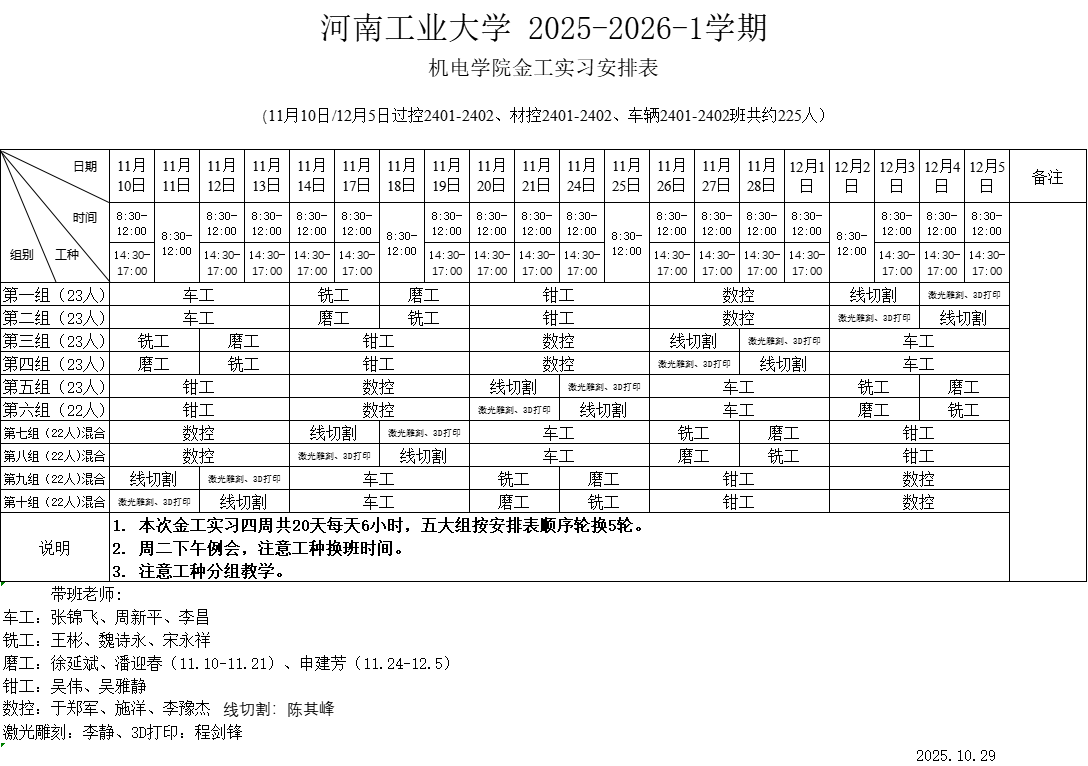 2025-2026-1学期机电学院金工实习安排表
